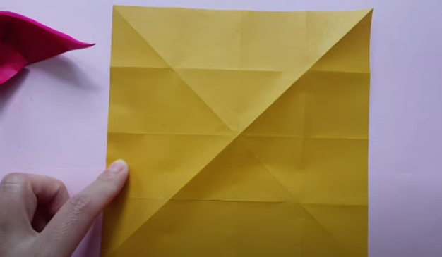 일반적인 색종이 하나로 제작을 시작하면 되세요. 네 모서리가 가운데 모양으로 오도록 잡아서 접어주세요.